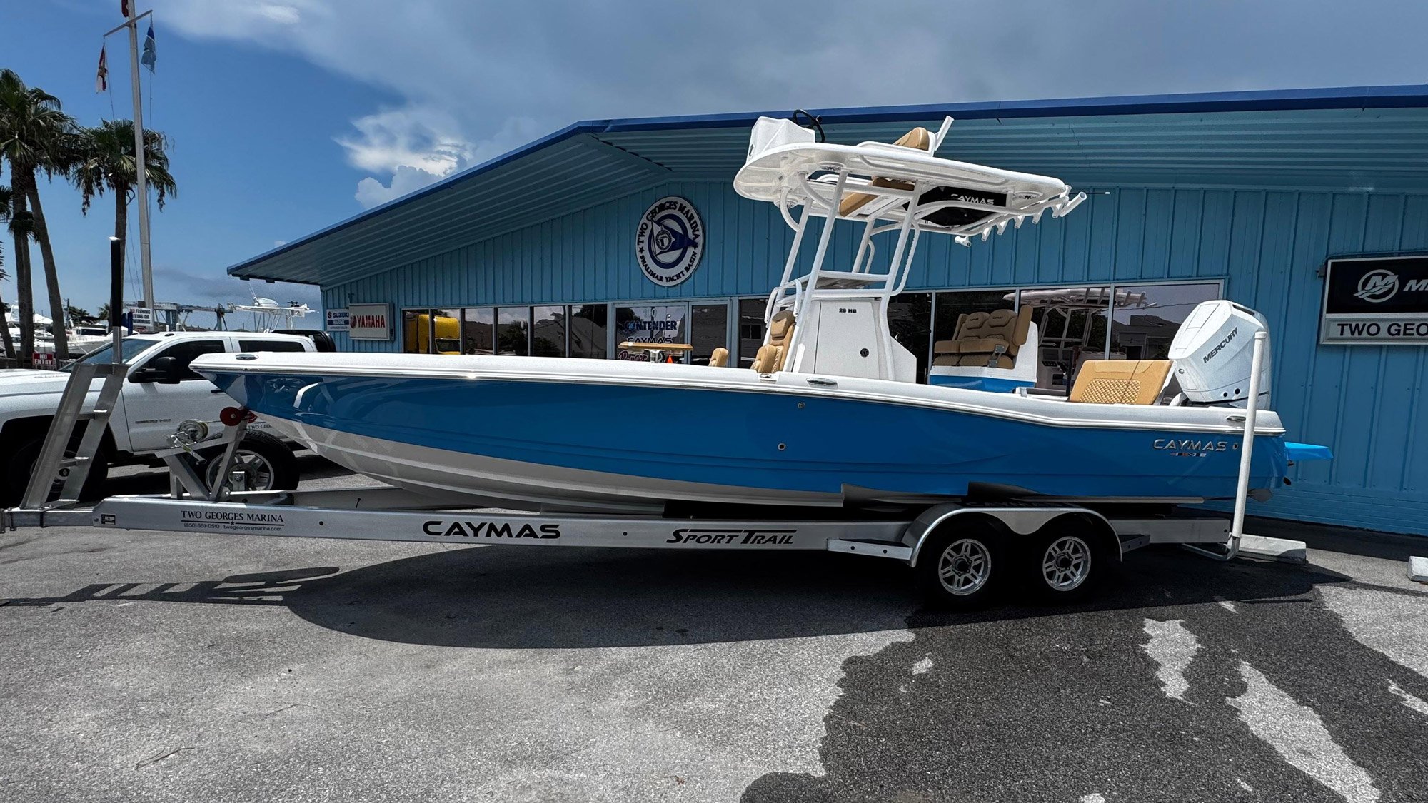 Mercury 400 V10 / second station / twin 12” Garmins / Ocean Blue hull / white powder coating / Edson Special Ops wheels / complete upholstery package / removable bow table / freshwater system / custom Sport Trail trailer