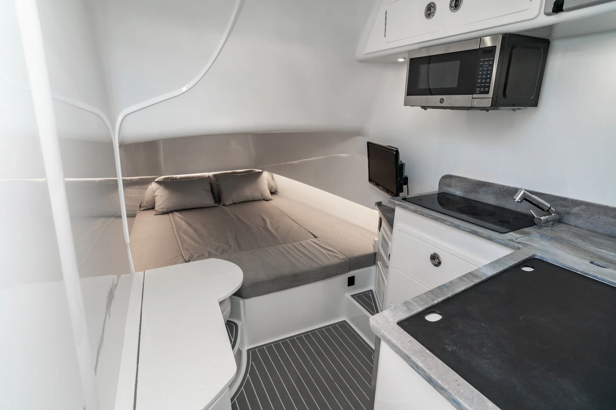 Center console fishability combined with comfortable overnight accommodations.