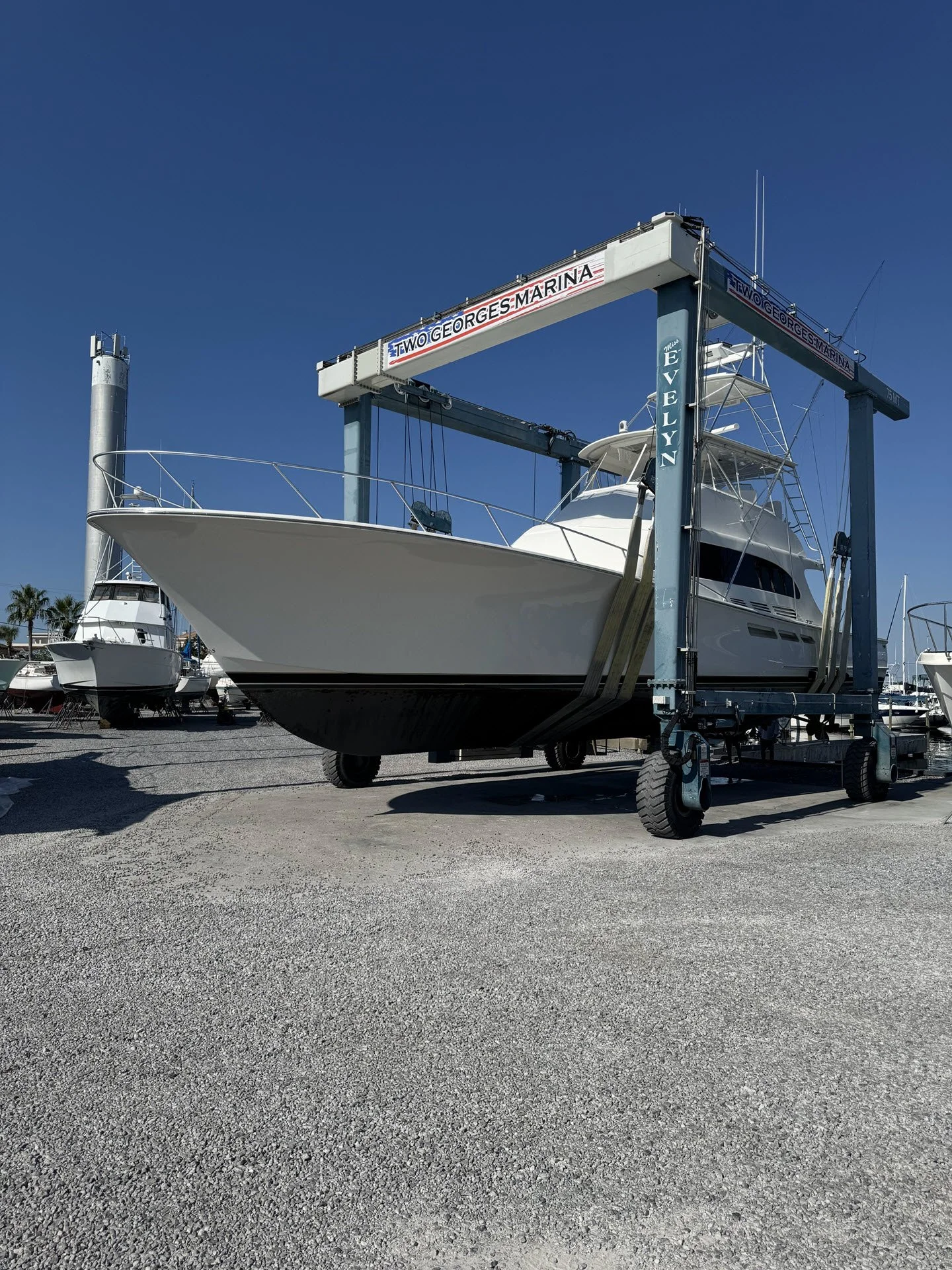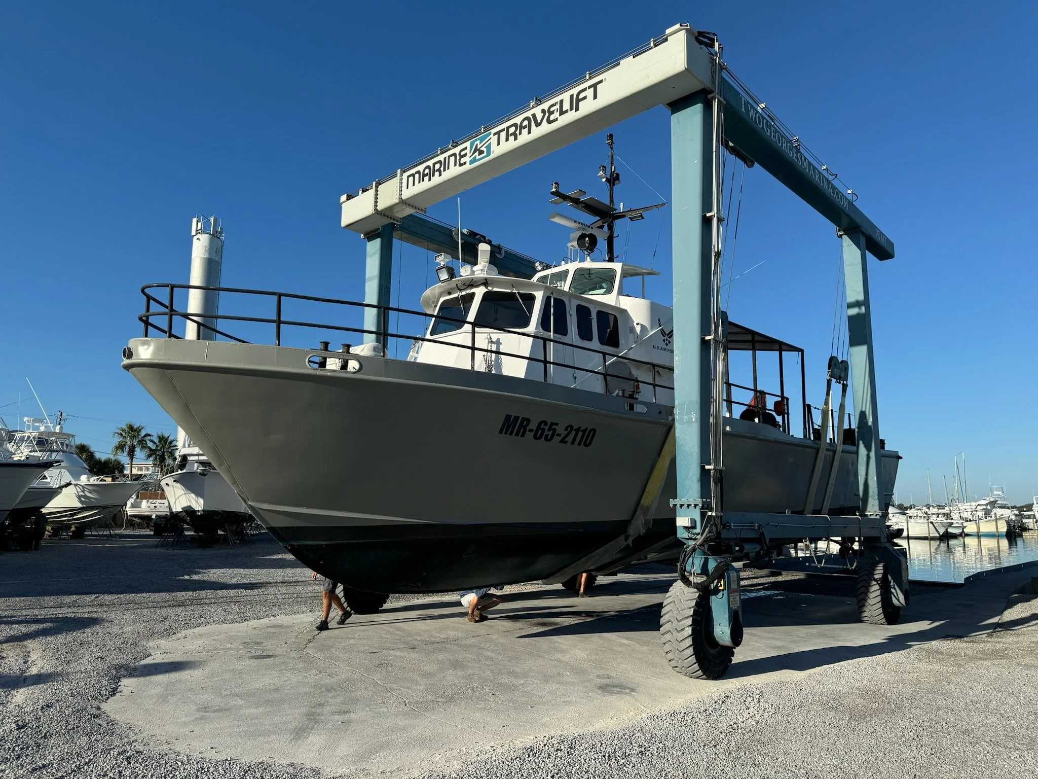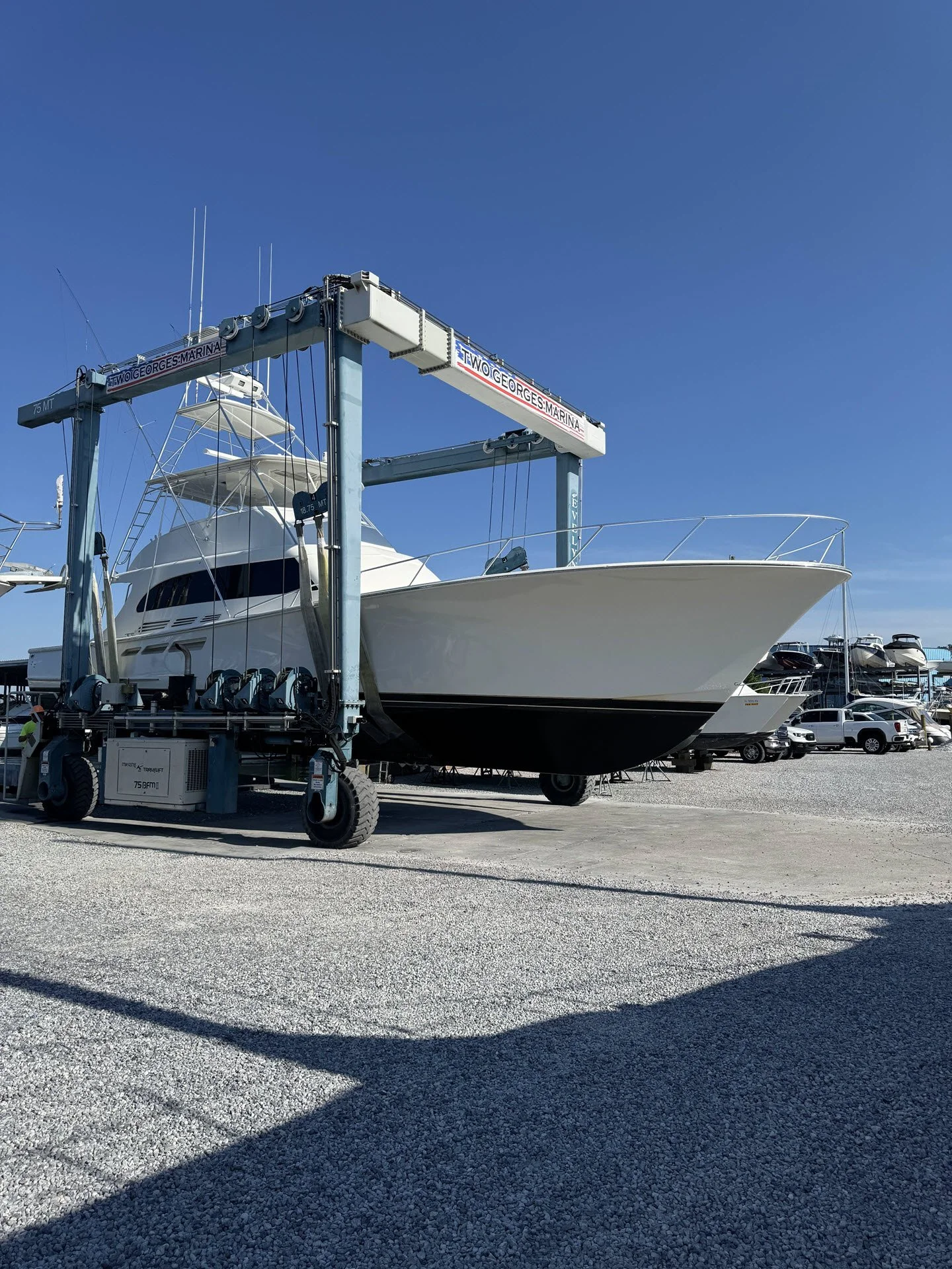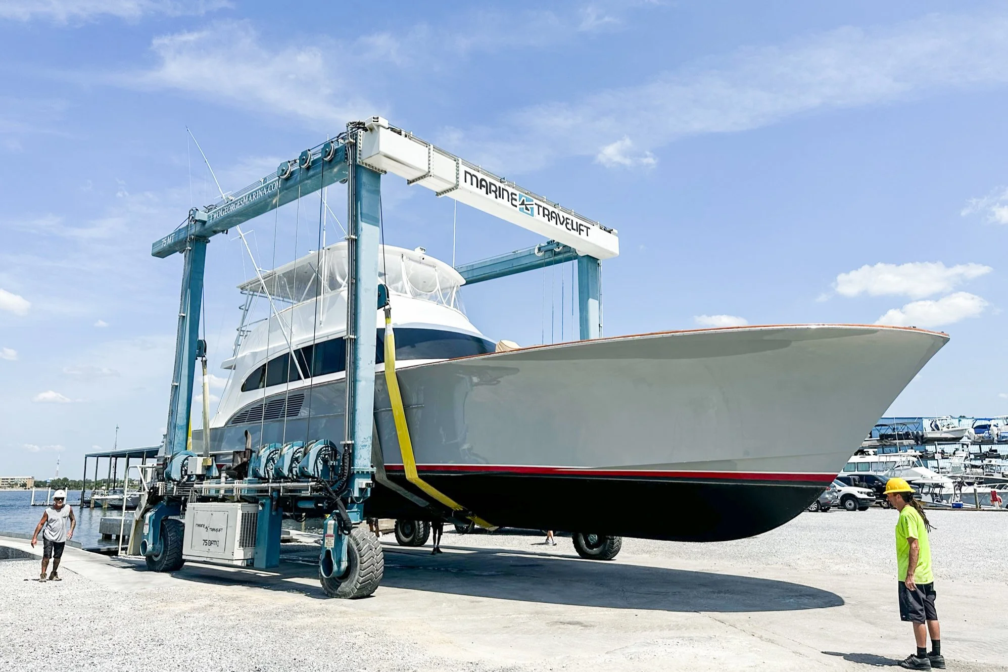 Two Georges Marine operates 75-metric-ton and 30-metric-ton Marine Travelift hoists, allowing our experienced and well-trained yard crew to safely haul vessels up to 165,000 lbs. with beams up to 22 feet. Our lifting equipment and trained operators ensure vessels are handled carefully and efficiently for maintenance, inspection, repairs, and bottom services.