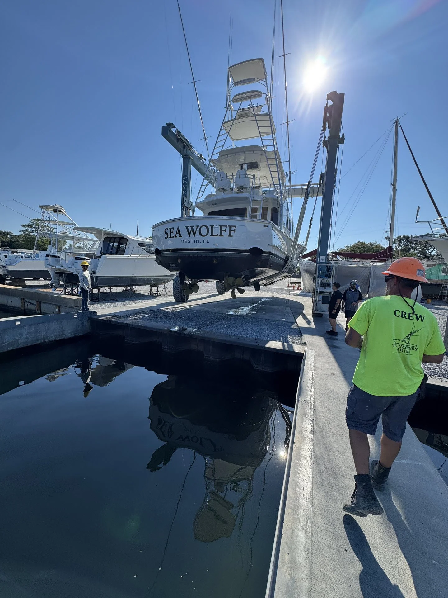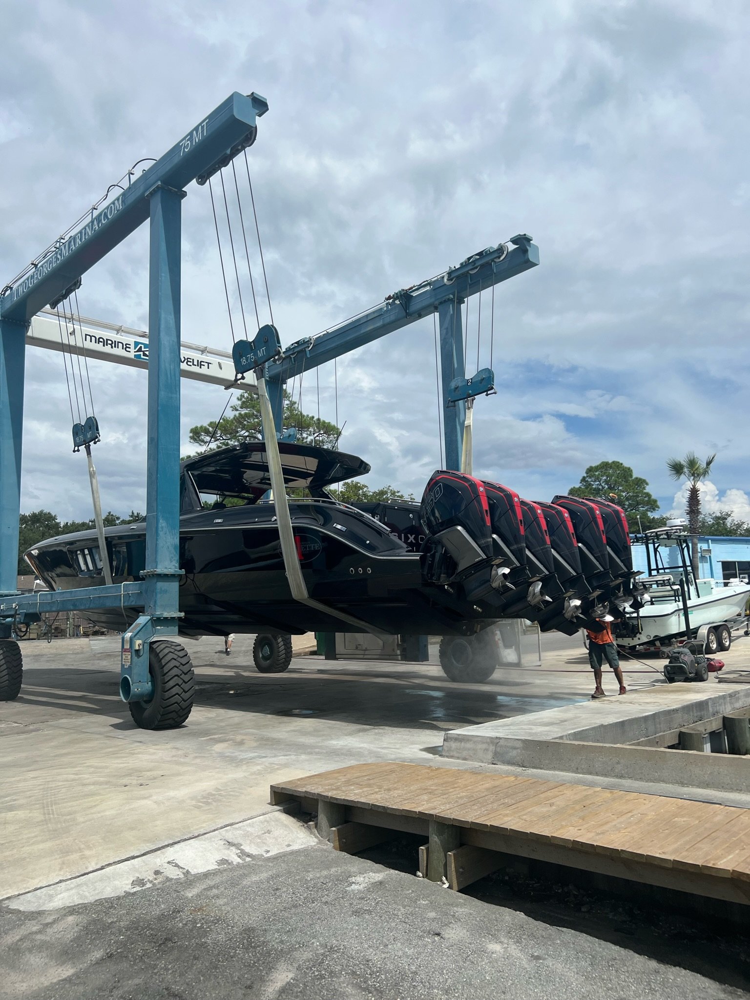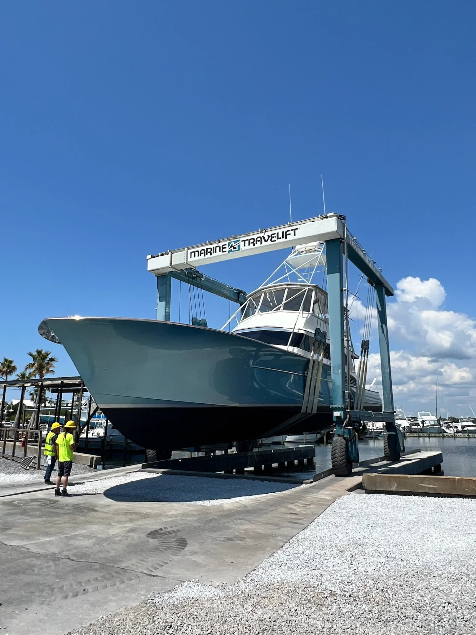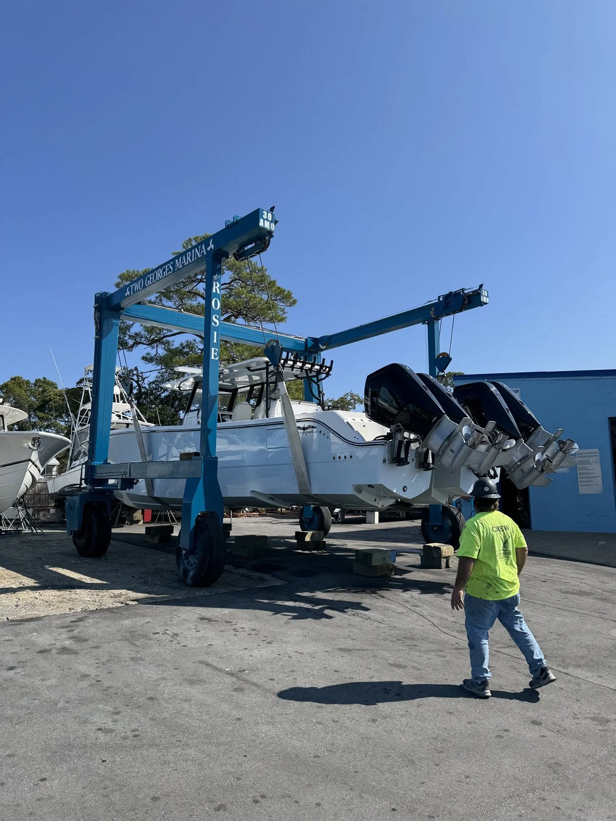 Two Georges Marine operates 75-metric-ton and 30-metric-ton Marine Travelift hoists, allowing our experienced and well-trained yard crew to safely haul vessels up to 165,000 lbs. with beams up to 22 feet. Our lifting equipment and trained operators ensure vessels are handled carefully and efficiently for maintenance, inspection, repairs, and bottom services.