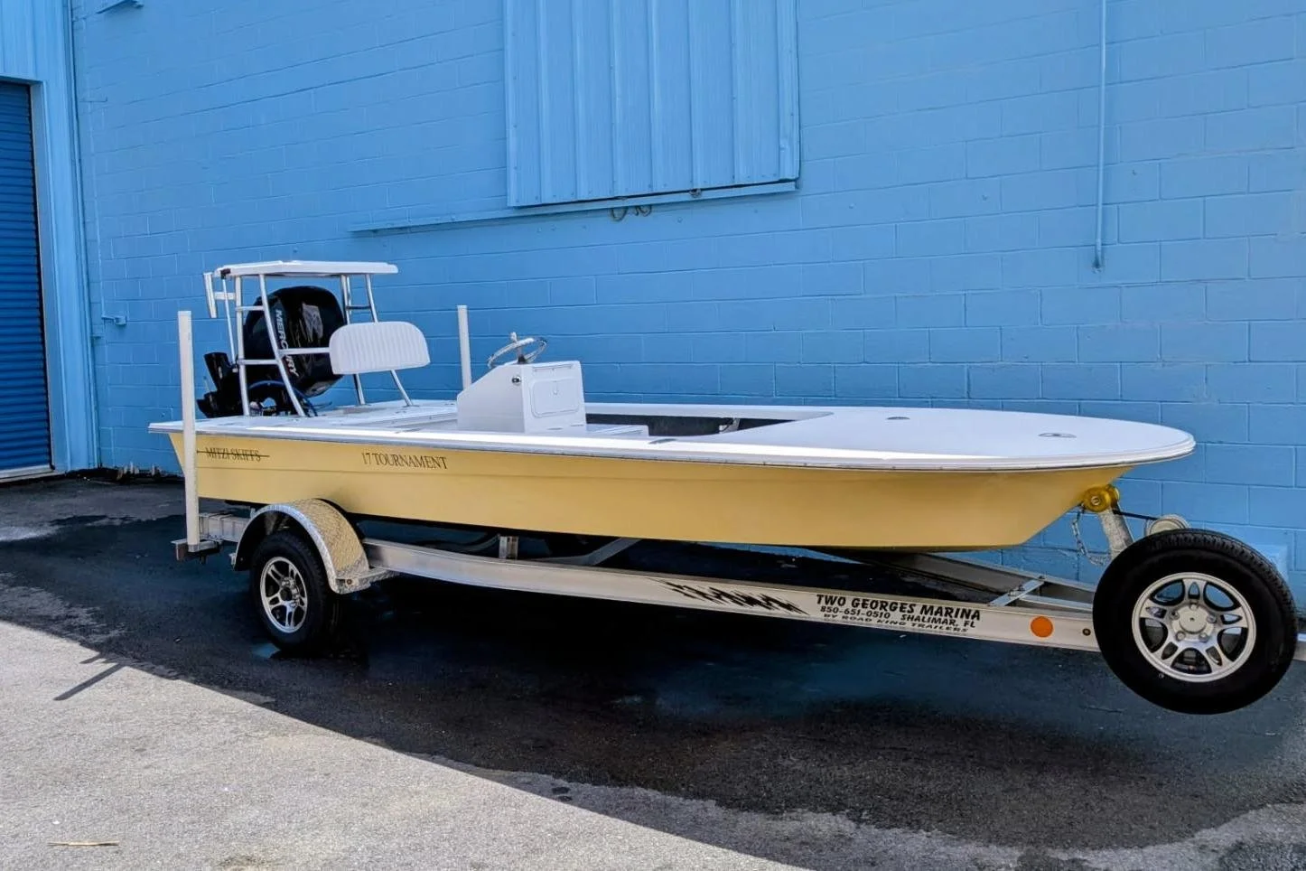 Mercury FourStroke 60 // Fighting Lady yellow hull // folding backrest // oversized poling platform with toe rail & rocket launchers // electric trim tabs // Atlas Micro Jacker jackplate // stainless rub rail // Road King aluminum trailer with torsion axle, mag wheels, and spare tire //